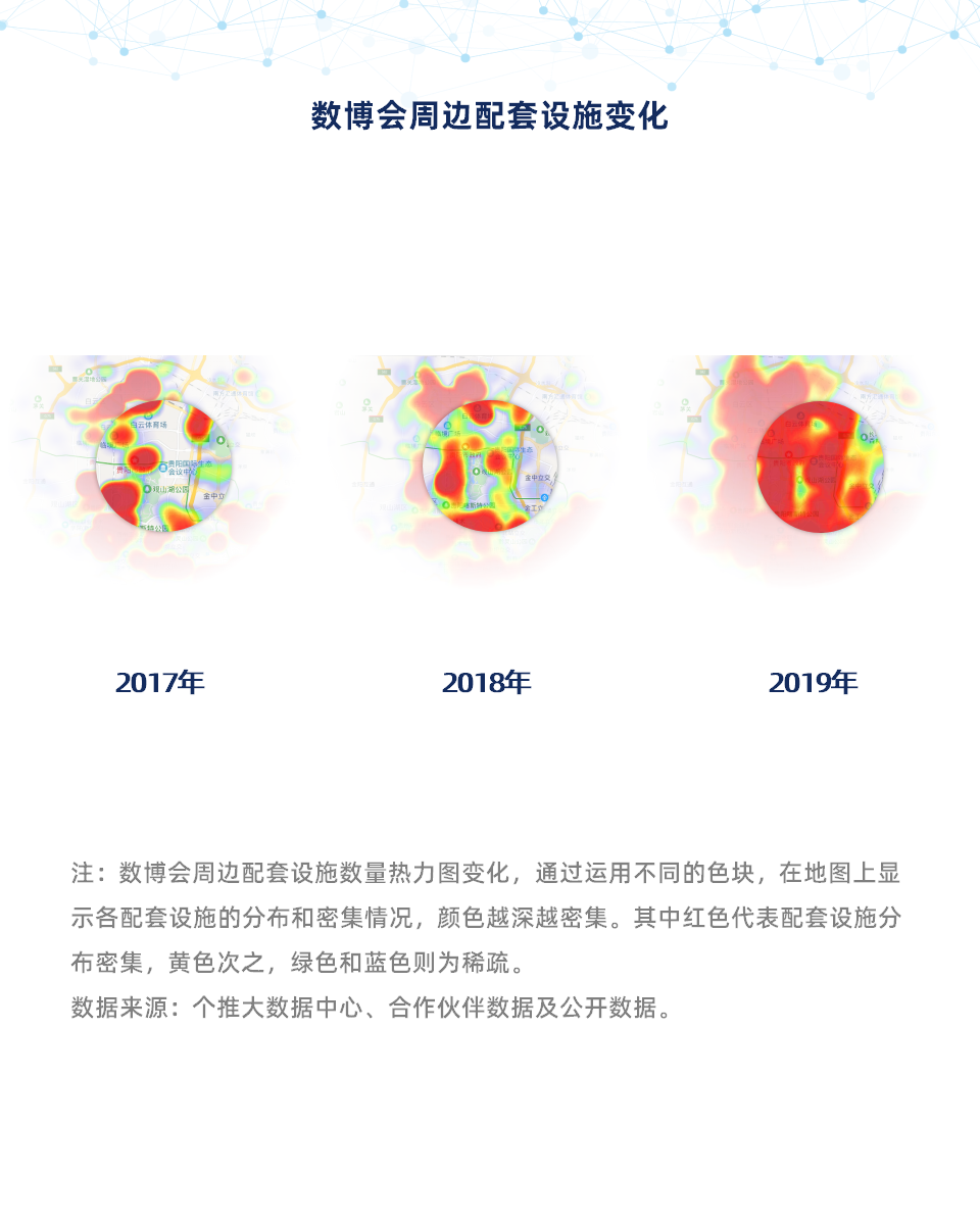 报告从数博会参展人数、客流来源、周边配套设施、周边企业发展等多个维度展开深入分析,并通过热力图等方式进行大数据可视化展示。个推大数据研究发现,数博会就像是一台超级“增长马达”,不仅吸引越来越多的参会者,更以惊人的速度带动着周边区域配套设施的建设,加速了区域高新技术企业数量的增长,同时也吸引了大量的优质人才。