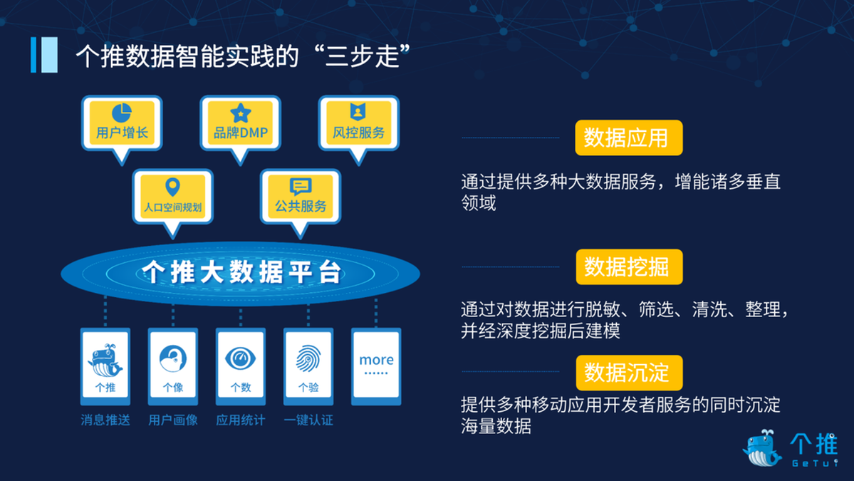 个推很早就开始在数据智能领域布局,已经形成了数据沉淀、数据处理和数据应用的产业闭环。个推基于自有数据,通过反复提炼,最终将脱敏、筛选、清洗、整理后的数据通过各种各样的模型深度挖掘,提炼价值,为移动互联网、品牌营销、风控服务、全域旅游、智慧城市等领域提供多元化的数据解决方案。