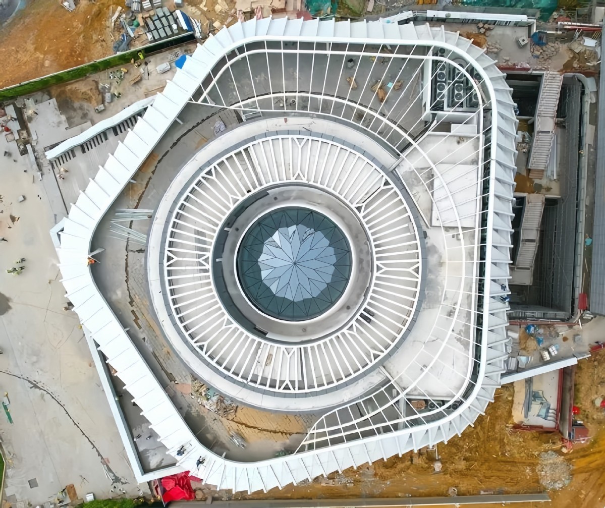 一期工程为2-7智慧云台公区内装,建筑以五边形为母体,以韵律感强、现代简约的杆件,富有张力的幕墙造型为外饰,打造飘浮的展馆。建筑造型奇特,炫酷非凡,像一颗不规则状的钻石。大堂入口门厅采用波浪式的铝格栅造型,赋予建筑流动的韵律。