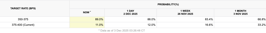 美国自动数据处理公司3日发布数据显示,美国11月私营部门就业岗位数据下修,市场降息预期进一步强化。芝商所“美联储观察”工具显示,市场对12月美联储降息的预期概率升至89%。
