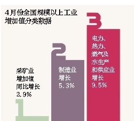 工业生产基本平稳,新产业新产品增长较快。4月份,全国规模以上工业增加值同比增长5.4%。1-4月份,全国规模以上工业增加值同比增长6.2%,增速与上年全年持平。