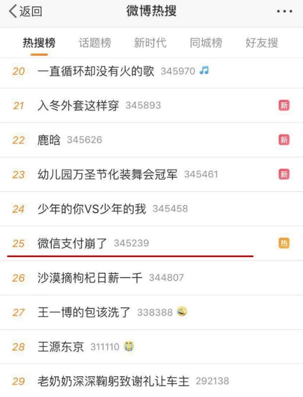 很快,“微信支付崩了”这一话题登上微博热搜榜。