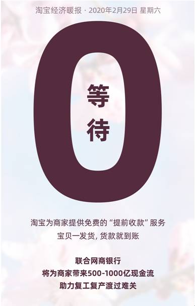 2月10日,在面向商家的10大举措中,淘宝推出国内电商平台第一个免费“0账期”服务——提前收款。商家发货后可申请由网商银行垫资货款,方便扩大再生产。