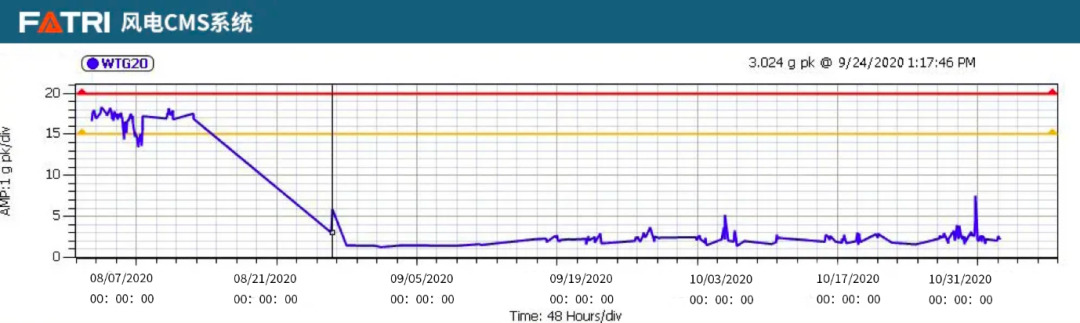 西人马工作人员在其风机安装传感器之后,发动机非驱动端轴承振动通频值检修前后对比如下图: