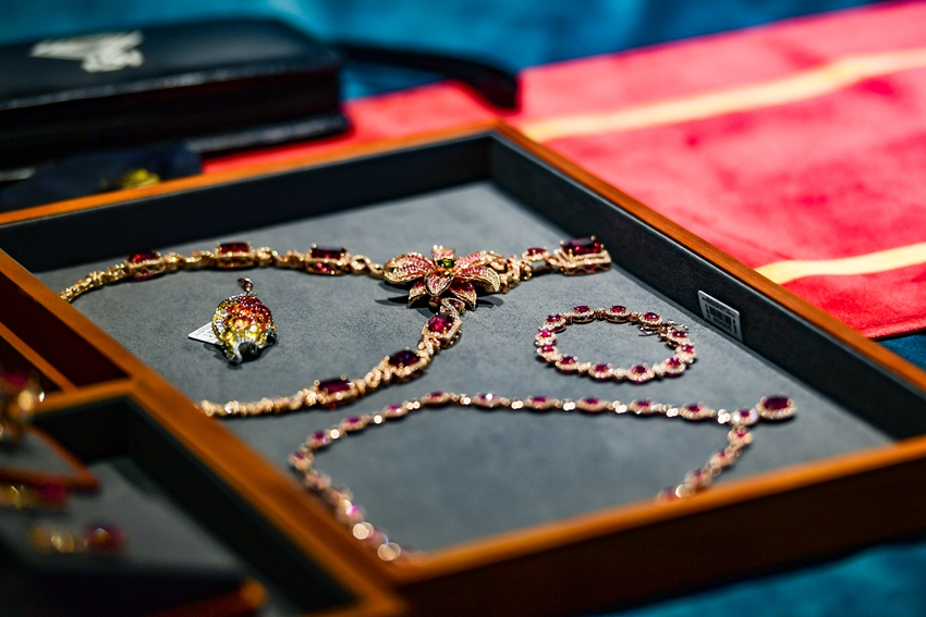 在品鉴会现场,价值百万的货品多达数十件,其中到场的客户嘉宾及媒体达人都可近距离欣赏体验,感受顶尖级珠宝的非凡魅力,现场最为吸引人的莫过于一条价值200万的碧玺套链,它以自然界的繁花姿态为设计灵感,由顶尖工艺大师耗费约340小时打造而成,其中镶嵌了重达37.68克拉的卢比莱碧玺,缀饰为红宝石及钻石,极尽奢华,将润金店的工艺水准与艺术造诣呈现得淋漓尽致。