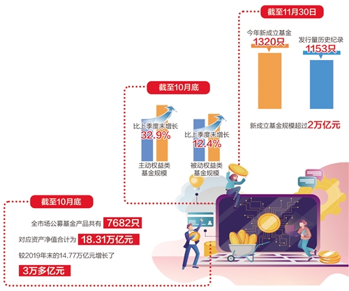 中国证券投资基金业协会最新数据显示,截至2020年10月底,全市场公募基金产品共有7682只,对应资产净值合计为18.31万亿元,较2019年末的14.77万亿元增长了3万多亿元,这是公募基金资管规模首次突破18万亿元,也是我国资本市场创立30年来公募基金数量首次突破7000只大关。