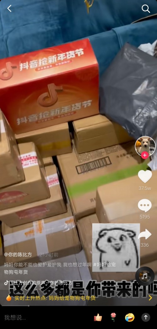 近日,抖音创作者@你的陈比方拍摄的一段母亲给家里狗子准备大堆年货的视频走红网络。目前该视频还登上了抖音实时热榜,看过视频的网友都表示狗子也太幸福了!