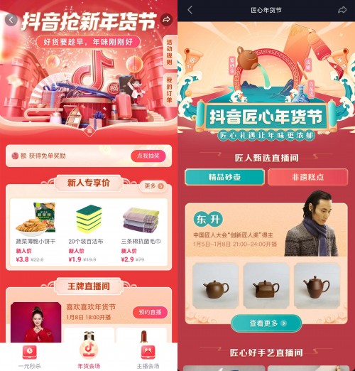 此外,我们打开抖音年货节页面,还发现上面有“匠心年货节”的板块,汉服、油纸伞、紫砂壶、皮雕艺术品等很多优秀传统手工艺作品都可供选择。