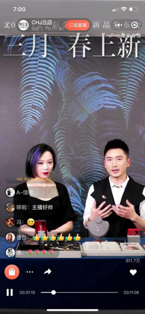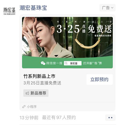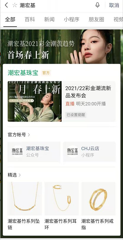 3月25日腾讯X潮宏基一场视频号&小程序的直播,创下了6213WGMV,观看量超120W,互动量超850W的新纪录,创造这一场奇迹不是快消新贵、也不是新国货美妆品牌,而是高价珠宝行业的中国时尚珠宝品牌潮宏基,以品牌2021年彩金潮流新品发布直播获得了用户的青睐,刷爆了朋友圈。