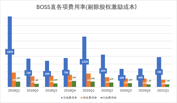 市场费用在每年一季度达到峰值(招聘行业讲究“金三银四”),但占营收的比例逐年降低。2019年Q1市场费用3.03亿(剔除股权激励成本,下同),占营收的184%;2020年Q市场费用增至3.72亿、占营收的比例降至132%;2021年Q1市场费用达6.17亿、占营收的78%。