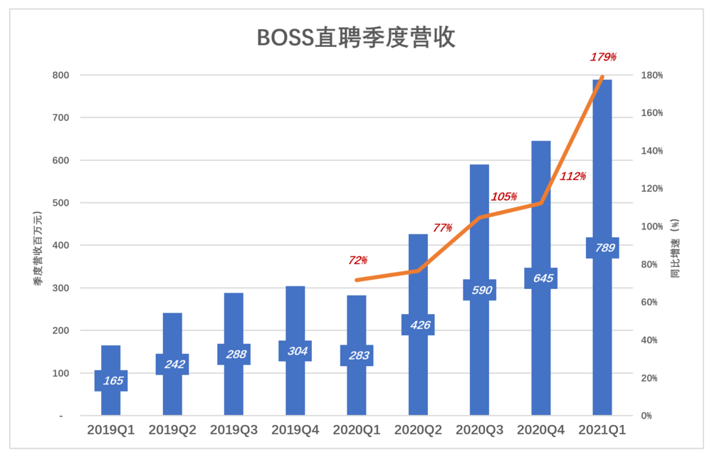2021年BOSS直聘进一步提速,Q1营收7.89亿、同比增长179%(2020年Q1营收2.83亿、同比增长72%)。