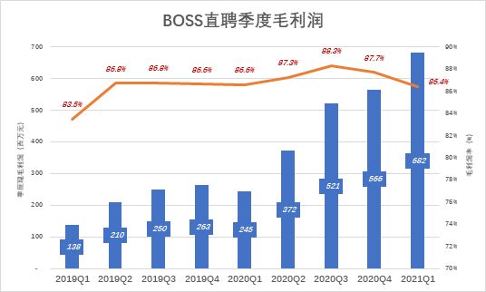 BOSS直聘毛利润率具有轻微的季节性波动,一季度较低、二/三季度为全年峰值。2021年Q1毛利润6.82亿元,毛利润率86.4%。