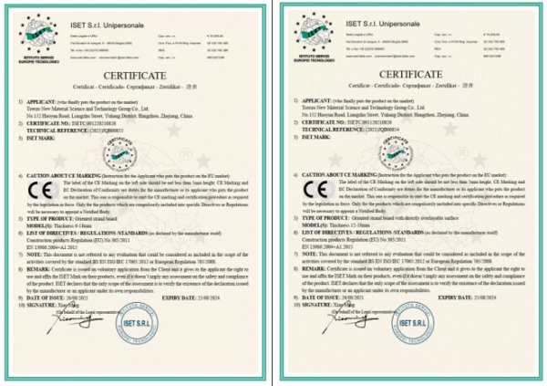 左:定向刨花板CE证书/右:可饰面定向刨花板CE证书