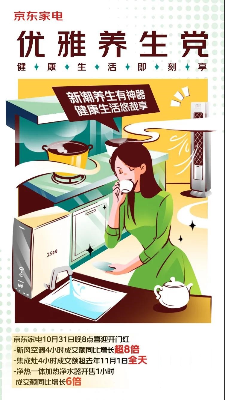 根据京东家电10月31日,晚8点开门红统计数据显示,截至11月1日00:00,能解决越睡越困问题、时刻为室内增氧换气的新风空调成交额同比增长超8倍。集蒸箱、烤箱、油烟机、灶具于一体,能最大化节省厨房空间,让家装颜值上升的蒸烤一体集成灶,4小时成交额超去年11月1日全天;万元以上蒸烤一体集成灶成交额同比增长3.5倍。还有多档水温、方便每个家庭成员随时使用的净热一体加热净水器开售1小时成交额同比增长6倍。