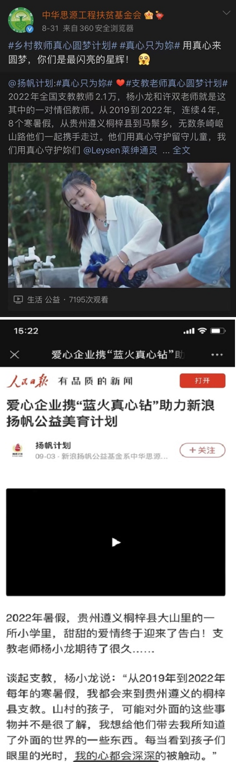 他们朴素却不平凡的经历吸引了包括北京电视台在内的诸多主流媒体关注报道。“真心守护计划”为支教老师拍摄的情感圆梦纪录短片一经发布,便得到了人民日报客户端、微博、抖音等媒体和社交平台上众多的关注与支持。