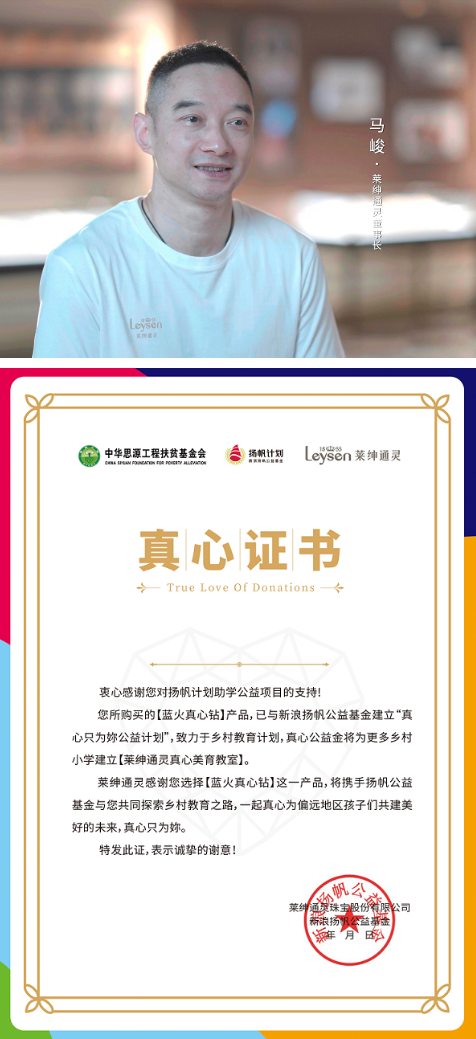 蓝火真心钻·真心只为妳,是莱绅通灵品牌核心价值观,这不是一句简单的承诺,更是真心的力量!今后,莱绅通灵将在这条公益之路上继续探索,发挥企业所长,为公益事业贡献更多力量。