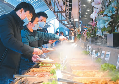 近期,天津线下餐饮、旅游、购物等消费业态回暖迹象显著。图为顾客在天津恒隆广场一家自助餐厅内取餐。