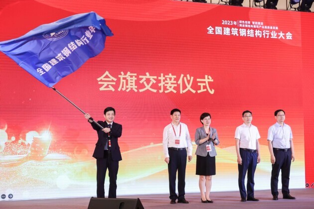 在与会领导、来宾的见证下,中国建筑金属结构协会秘书长宋为民、副秘书长兼建筑钢结构分会会长孙晓彦从中冶(上海)钢结构科技有限公司副总经理兼总工程师李旻手中接过象征着全国钢结构年度行业大会承办权的会旗,郑重地交到2024年会的承办单位山东钢铁集团有限公司张军与山东聚鑫集团钢结构有限公司总经理高学书手中。2024年我们挥师济南!