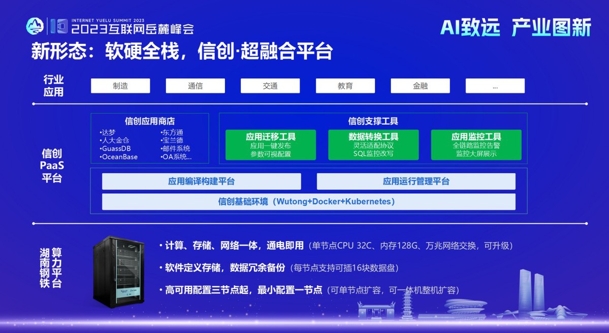 由拓维信息共同举办的岳麓峰会“AI致远 产业图新”专场论坛上,兆瀚信创超融合一体机正式亮相。湖南钢铁集团旗下华联云创联合拓维信息,基于兆瀚国产自主服务器算力底座,将云原生、分布式存储、软件定义网络、安全虚拟化等业界前沿技术融为一体,为用户提供安全稳定、通电即用的信创构建服务,满足用户开箱即用、快速上架、极简运维的需求。
