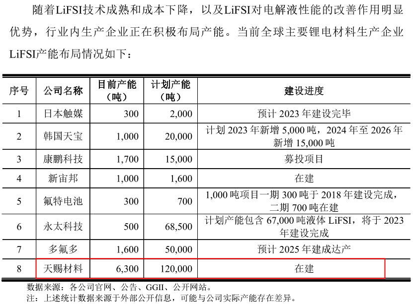 在康鹏科技此次IPO的问询回复中,其依据客户天赐材料的公告测算了该客户LiFSI产品的未来扩产情况、需求量及产能缺口。