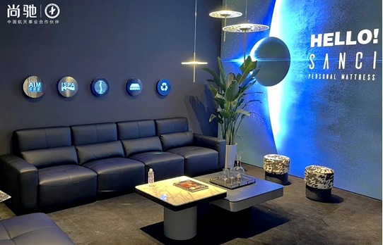 尚驰「航天」空间展馆,以蓝黑为主调,深邃、稳重、未来感十足,吉祥物太空狗「小驰」耳目一新,代表着守护人类健康深睡;灯光画布等配饰方圆交互,构筑身心、视觉多重舒适体验,贴合诠释了尚驰科技、深睡、精定制的品牌调性,彰显了尚驰对“睡眠”的极致思考。