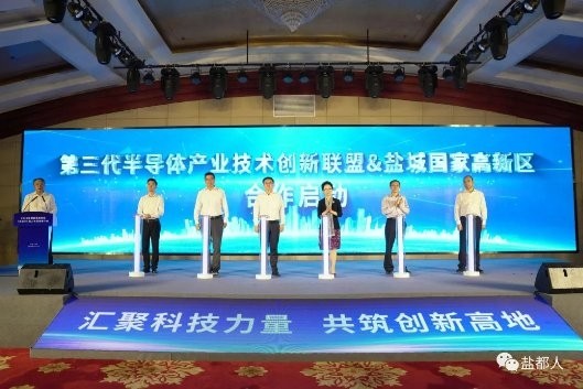 ▲活动中,与会专家、领导共同开启“第三代半导体产业技术创新联盟&盐城国家高新区合作”启动仪式