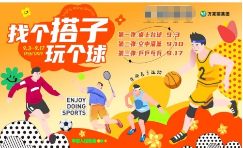 宇宙中心万家丽,潮玩青年活力无限的加油充电站。#找个搭子玩个球#火热开启,宇宙中心三场大赛即将拉开帷幕,高燃Battle,巅峰对决,以运动会友,重燃青春热爱,同步赛场激情。第一弹:台球,9月3日,当日消费满199元的美妆会员用户,拍照打卡参与互动话题,即可参加台球互动游戏;第二弹:篮球,9月10日,当日消费满199元的美妆会员用户,拍照打卡参与互动话题,即可参加篮球投球游戏;第三弹:乒乓球,9月17日,当日消费满199元的美妆会员用户,拍照打卡参与互动话题,即可参加乒乓球互动游戏,获胜组获得抽奖机会一次。人在长沙,心在万家丽,快喊上你的运动搭子,来万家丽玩球,一起逃离生活的无聊戏码。