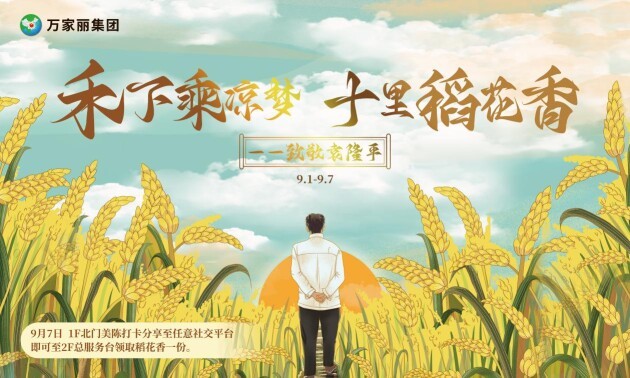 “禾下乘凉梦,十里稻花香”是袁隆平院士毕生的梦想,他把功勋写在大地上,一生躬耕田间换得稻香丰年。9月7日是袁隆平院士诞辰93周年,风吹稻禾,永远怀念!9月7日下午15:00-21:00,顾客拍照打卡1楼国际大牌美妆区的“禾下乘凉梦 十里稻花香”美陈,分享至任意社交平台,并关注万家丽国际MALL官方微信、注册美妆会员,即可到二楼总服务台领取稻穗/稻苗一份,数量有限,领完即止。
