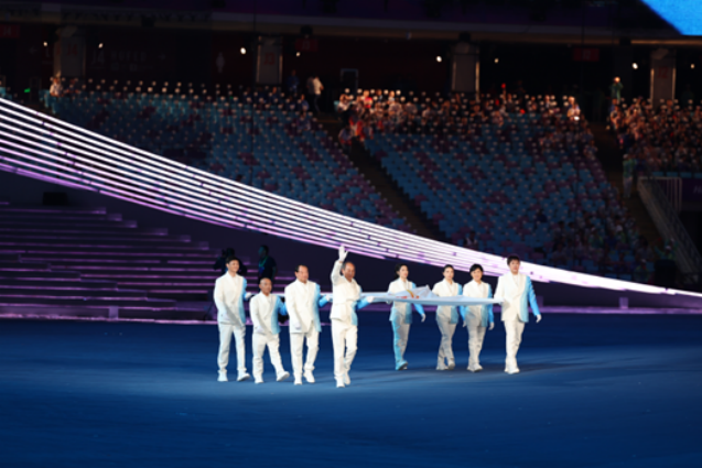 染晨曦,沐夜色,与星辰为伴。半年来,开幕服装总设计丁洁与时间赛跑,一千次振翅只为精彩瞬间。开幕式上,映入眼帘的“开幕仪式/会旗执旗手”服装,展现出本次亚运会所特有的东方意蕴:服装上“水晕光圈与运动赛道融合”的设计,搭配3D打印的“如意吉祥扣”,中式与未来科技感相融合,令着装的功勋运动员们展现江南韵味与写意美感形象而生动。当中国运动员孙海平、张蓉芳、许海峰、叶乔波、楼云、郭晶晶、仲满、罗雪娟手持亚奥理事会会旗入场的时候,庄重而神圣的氛围使得此款设计显现出东方韵味与亚运精神。