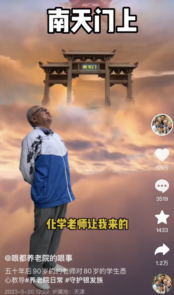 天津市南开区红日南路上,静雅养老院,最近也“哏”出了圈。熟悉的网友可能更为了解的是名为 @哏都养老院的哏事 的网络社交账号,从今年4月开始发布作品,仅仅半年的时间全网粉丝量就超过了100万,90后“捧哏者”陈卓和一群“90后”老人们一起,自导自演的短视频,在网络上打造出了属于自己的一片领地。