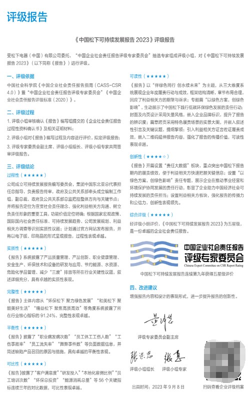 《报告》以“伴绿色同行 创永续未来”为主题,筛选利益相关方最关注的社会责任议题,通过“环保松下 聚力绿色发展”“和美松下 聚能美好生活”“精益松下 聚焦高质高效”三大维度系统全面展示松下在企业治理、产品品质、客户服务、环境保护、伙伴合作、供应链管理、员工发展以及公益志愿等可持续发展议题下的行动与成效,充分展现了松下践行松下幸之助许下的“为中国社会作贡献”的承诺,秉承“关护无界 身心如悦”的事业愿景,携手为中国高质量发展贡献松下才智与力量的不懈坚持。