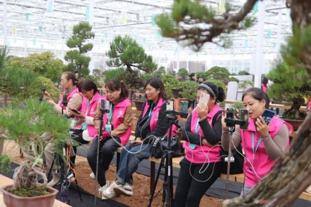 占地20000平方米的超大电商直播活动区内,整齐展列着展品与拍卖品,近500人报名参加直播带货比赛,角逐“带货王”称号。主播们手持设备带领全国各地观众“云逛展”,通过直播集中展现盆景共享电商直播的魅力,动静交互,讲解小微盆景的独特风格和艺术魅力,分享盆景艺术文化,为观众带来沉浸式消费体验。首场盆景直播带货吸引了线上万人关注。主播们架手机、打灯光、与粉丝热情互动,GMV排行谁主沉浮?静待观战!