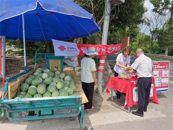今年7月下旬,青浦区某村的小西瓜由于连月的阴雨天气延迟成熟,失去了最佳上市时机,遭遇滞销危机,瓜农的小西瓜只能堆放在瓜棚里。瓜农刘大姐愁容满面地说:“现在还有很多瓜直接烂在地里卖不了,看着挺心疼的。一年忙到头白忙了。”杨烨婷了解到果农难题后,带领营业厅团队到村子里开展线下惠民助农活动,通过现场销售、直播带货等方式帮助农民售卖小西瓜、促销新鲜蔬菜,广受村民的好评。