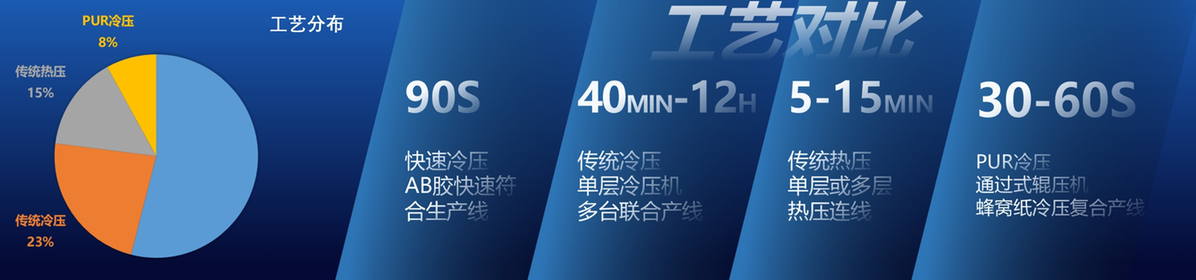 谈工艺离不开成本和效率。如上图可以看到,PUR冷压的效率是传统热压或传统冷压的几十倍,甚至上百倍。其中尽管传统冷压成本是最低的,但它的效率相应也是最低的,“它占地面积最大、所用人员最多”,程汉文补充道。