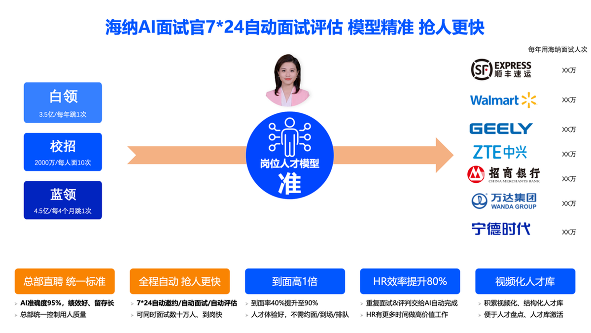 海纳AI聚焦打造AI面试测评平台,已为沃尔玛、顺丰、吉利、中兴通讯等数十家500强企业面试超过700万人。7*24小时自动邀约、自动面试、自动评估、AI模型精准,尤其适合大规模蓝领招聘、校园招聘、白领初阶岗位招聘。
