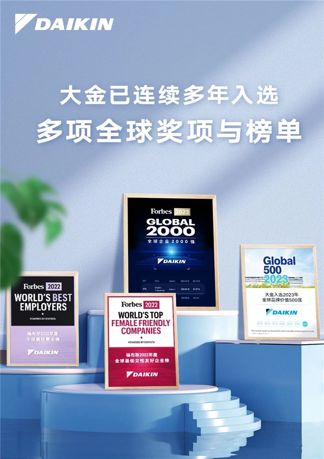 大金企业经营发展再创新高,2023年大金陆续获得“全球品牌价值500强”、“福布斯2000强”、“胡润世界500强”、“福布斯全球最佳雇主”等国际奖项认可,享誉全球。