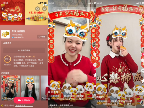 中粮福临门在抖音平台上巧妙地运用了流行的爆梗玩法,推出了一场主题为#福运龘龘#的现金福利“全民任务”。这一创新的营销活动不仅激发了广大用户的参与热情,更在新年期间掀起了一场现象级的互动热潮, 实现全网近20亿次曝光。通过这一创新互动,用户纷纷分享自己的新年幸福瞬间,展示了丰富多彩的生活内容,进一步拉近了品牌与用户之间的距离。