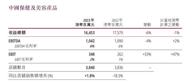 据屈臣氏母公司财报显示,2023年,屈臣氏中国区实现营收164.53亿港元(约合人民币151.46亿元),EBITDA息税折旧摊销前利润则录得10.42亿港元(约合人民币9.59亿元),扣除汇率变动影响同比增长2%,EBIT息税前利润则同比增长47%。