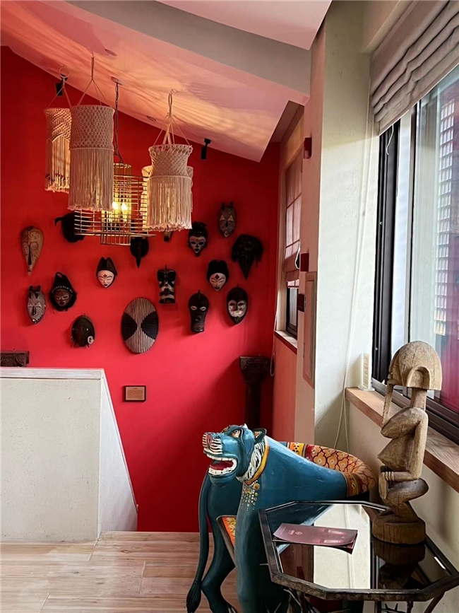 如今,这些面具被装饰在民宿楼梯间的红墙上。对方蕾而言,这些面具代表了自己一直以来的美学观点:艺术同源,文化同根。从一张非洲的民族面具,可以看到不同文化的身影,这彰显了人类共同的情感。“我一直坚信,人类对美的感受是共通的,尽管因时间、地域的限制,表达方式各异,但细细探索,总能找到它们之间的联系。”