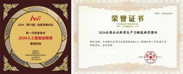 鼎茂科技凭借AI创新技术,和有效赋能案例——某大型国有银行建设「大型银行分布式系统智能化RCA(根因分析)和处置平台解决方案」,在评审中脱颖而出,荣获“新质生产力典型案例”和“人工智能创新奖”双料殊荣,成为彰显新质生产力发展成就的典范。