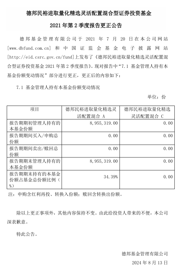 根据德邦基金公布的更正公告,德邦民裕进取量化精选灵活配置2021年二季度报告中,曾对报告期期末基金管理人持有A类基金份额占基金总份额比例录入为0,更正后的数据为34.39%,其他内容保持不变。