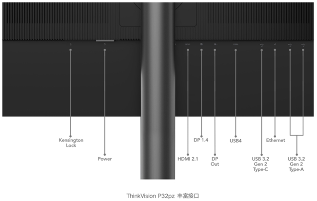 在对效率极致追逐的现代社会,显示器的兼容性也是提升工作效率的关键。ThinkVision P32pz/P27pz机身集成了多达13个接口,包括 HDMI 2.1、DP 1.4、USB 3.2 Gen 2 和 Ethernet等主流接口,支持DP菊链、外设连接、Type-C充电等需求,满足用户的多设备连接需求。除此之外,此系列还在显示器中引入了 USB4 接口,将能量和传输速率拉满,一根线传输音视频信号的同时,还能提供至高140W的反向供电,不需要适配器,即可快速连接各类笔记本电脑,提升使用体验的同时,桌面更整洁。