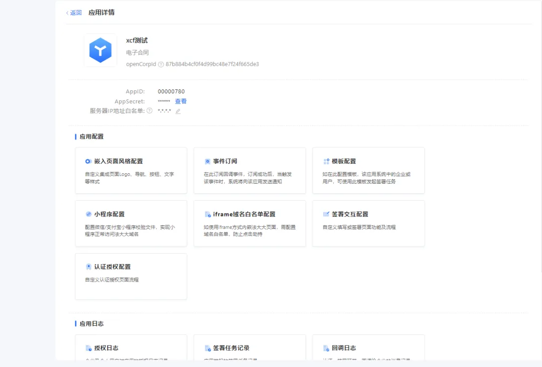 第二步:在对应应用下,集成方可以在每个应用中独立设置相关配置项,如应用配置(EUI界面自定义配置、模板配置、小程序配置、域名白名单配置)、应用日志、应用服务等。