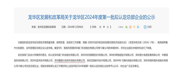 2024年12月06日 ,根据《深圳市龙华区加快发展总部经济实施办法》(深龙华府办规〔2024〕2号),综合各部门及会计师事务所意见,深圳爱图仕创新科技股份有限公司(以下简称爱图仕)等10家企业被认定为区总部企业。