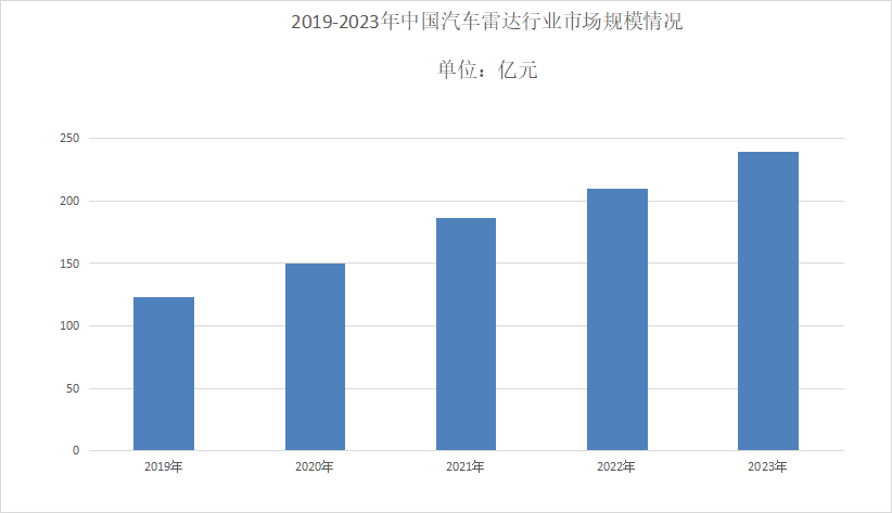伴随新能源汽车行业的快速发展和自动驾驶技术的日益成熟,也同时带动了汽车雷达市场的增长。据数据显示,国内2023年汽车雷达市场规模达239亿元,同比上涨了50.55%,2017-2023年期间复合年增长率达19.73%。其中,毫米波雷达在中长距离探测上表现出色,是新能源汽车的核心传感器零部件,占据着汽车雷达行业的大部分市场份额,占比高达54.9%。