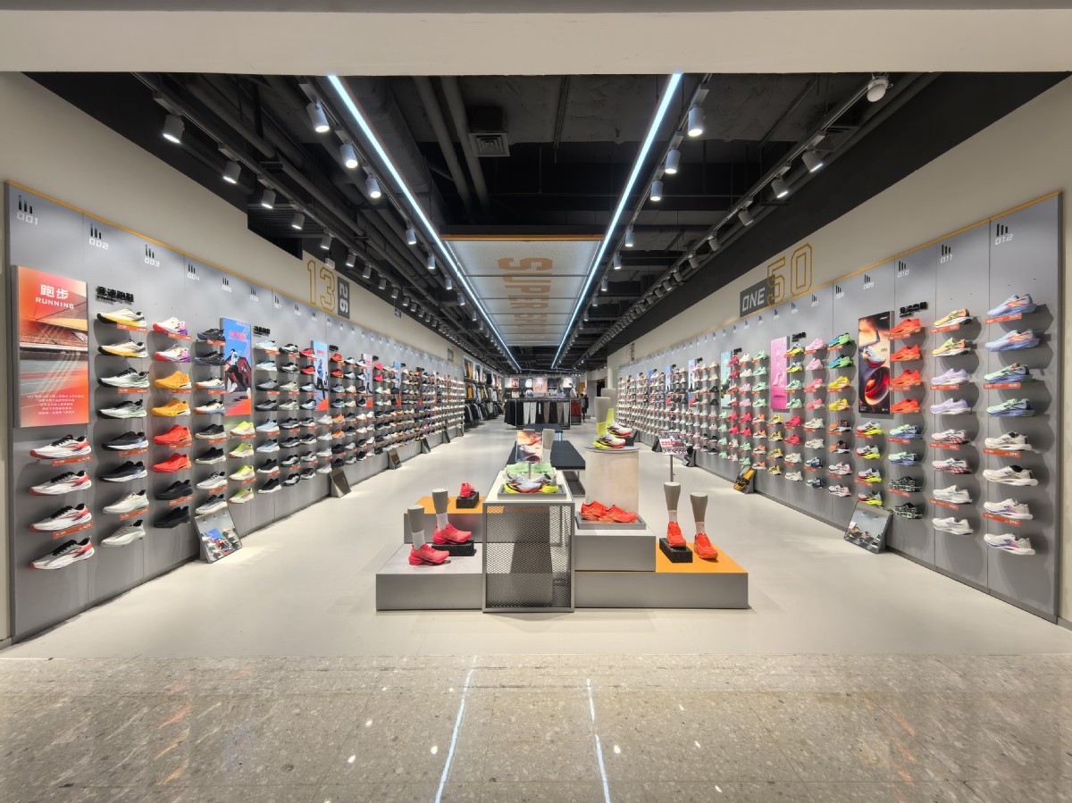 品类覆盖则打破边界,从四季商品到全年龄段需求一应俱全。除了涵盖跑步、篮球、综训、运动生活等常规品类外,还囊括网球等新品类。尖货SKU数量较大多数常规店更多,例如跑鞋细分为竞速、功能、通勤、日常四大系列,休闲鞋划分为复古文化鞋与经典板鞋。尖货SKU如“飞飚2”“飞燃4”等热门配色集中陈列,搭配国旗款羽绒服等差异化产品,有效满足全年龄段客群在不同场景的装备需求。同时,配合店内灵活促销的策略吸引客流,实现“质价比双优”的消费自由。而自助扫码购、电子价签等数字化手段简化流程,10-12名店员即可高效运营超大空间,减少消费者决策时间。这种“自助式购物”模式不仅降低运营成本,更让“即买即走”的体验成为可能。