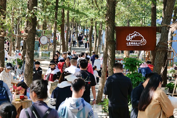 懒猫森林市集非遗匠人汇聚,植物拓染、木版年画拓印、团扇扇面绘制等诸多体验项目让人目不暇接。当然,懒猫森林还有各类美食,让烟火气与文化味相得益彰。