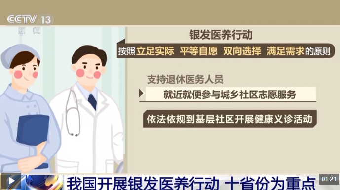 国家卫生健康委、民政部、人力资源社会保障部、国家中医药局、国家疾控局昨天(4日)发布通知,决定组织开展银发医养行动,支持退休医务人员到医养结合机构、养老机构等开展相关的医疗服务。北京等十个省份被确定为银发医养行动重点省份,探索形成可复制推广的工作模式。