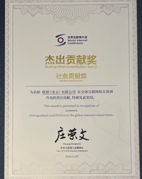 中国日报网11月9日电 在11月7日上午举行的2025世界互联网大会乌镇峰会开幕式上,联想集团凭借ICT行业领先的绿色化、智能化供应链建设,以AI技术赋能教育与公益事业的先锋实践,荣获“世界互联网大会杰出贡献奖”(社会贡献类)。